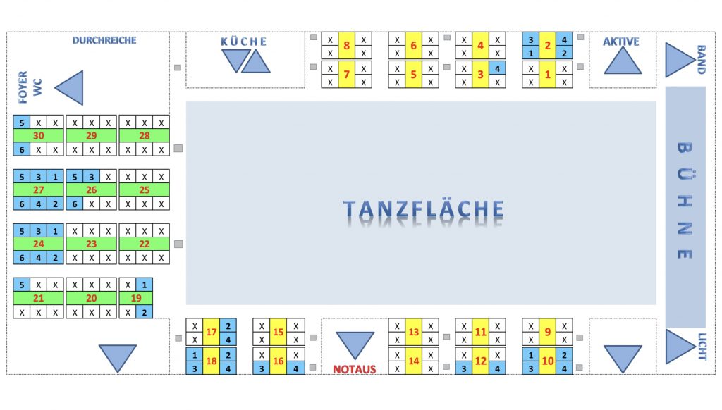 Auf dem folgenden Saalplan sehen Sie die tagesaktuelle Belegung und welche Plätze noch verfügbar sind: